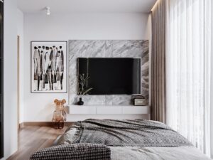Không thể thiếu kệ tivi với vách ốp giả đá cách điệu