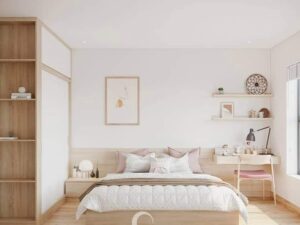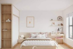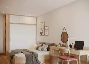 Phòng Ngủ được lựa chọn tông màu sáng đảm bảo sự đồng bộ với tổng thể căn hộ, kết hợp với nâu của gỗ tạo nên sự nhẹ nhàng, thanh thoát cho không gian gian.Với sự tinh tế trong cách bố trí nội thất giúp cho không gian tuy bị hạn chế về diện tích nhưng vẫn vô cùng ấn tượng và thu hút dù không có quá nhiều chi tiết cầu kì