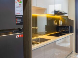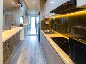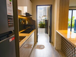Thiết kế tủ bếp đẹp chữ I là giải pháp tối ưu không gian hàng đầu dành cho phòng bếp chung cư 2 phòng ngủ. Nhiều gia chủ hiện nay còn ưa chuộng việc thiết kế tủ bếp kịch trần để tăng thêm diện tích lưu trữ cho khu vực này.