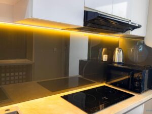 Hệ tủ bếp được tạo từ gỗ MDF, đá và kính. Đây là sự kết hợp hài hòa giữa tính thẩm mỹ và tính tiện ích. Bề mặt đá và kính ốp trên tường giúp việc làm sạch sau khi nấu nướng trở nên đơn giản và tiện lợi hơn. Thiết kế này không chỉ mang lại sự sạch sẽ và gọn gàng mà còn tạo điểm nhấn về mặt thẩm mỹ cho phòng bếp, tạo nên một không gian sống đáng sống và tiện nghi.