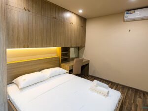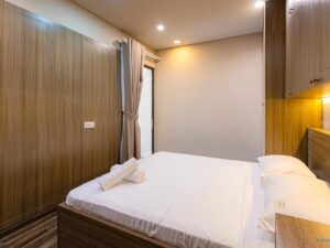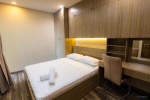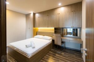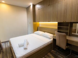 Phòng ngủ chính dành riêng cho vợ chồng được thiết kế với sự tận hưởng tối đa của không gian. Giường ngủ là trung tâm của không gian này, tạo nên sự sang trọng và thoải mái. Chi tiết này không chỉ mang lại tính thẩm mỹ mà còn tạo điểm nhấn cho không gian nghỉ ngơi.