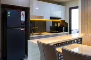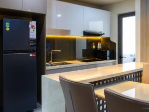 Phòng bếp được ưu tiên với sự cân nhắc tỉ mỉ đến cả tiện ích và thẩm mỹ. Bàn và ghế ngồi ăn đều có chân bằng inox mạ vàng, mang lại sự sang trọng và độ bền cao. Mặt bàn làm từ gỗ công nghiệp phủ Acrylic, vừa đảm bảo tính thẩm mỹ vừa đáp ứng yêu cầu về sự chịu lực và sử dụng lâu dài. Thân ghế được bọc từ da công nghiệp cao cấp, mang lại sự êm ái cho người ngồi, đồng thời dễ dàng vệ sinh và bảo quản.
