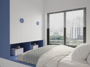 - Tủ áo: thiết kế liền với tủ và nhiều ngăn, giúp bé tự quản lý và giữ gìn đồ chơi ngăn nắp.