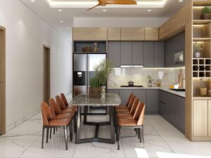 - Tủ bếp: Hệ tủ bếp trên và dưới bằng gỗ công nghiệp chống ẩm, màu xám kết hợp gỗ tinh tế, mang lại cảm giác sạch sẽ và hiện đại.