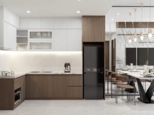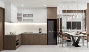 Không gian bếp với gam màu trắng và vân gỗ phối hợp nhẹ nhàng giúp mỗi bữa ăn trở nên ngon miệng và ấm cúng hơn bao giờ hết