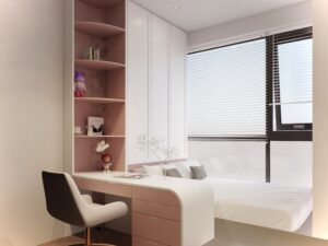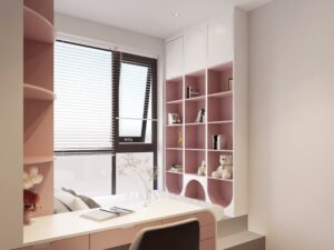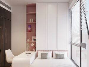 Phòng bé gái với gam màu trắng và màu hồng thể hiện sự nữ tính và dễ thương, không gian thoải mái cho bé thoả sức sáng tạo