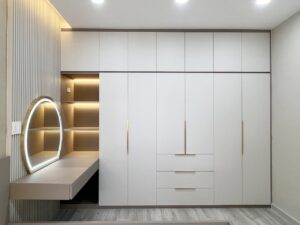 4. Bàn Phấn nhỏ liền tủ: Tạo kết nối liện mạch giữa tủ và bàn phấn, với cách bố trí khoa học giúp tiết kiệm được không gian hơn.