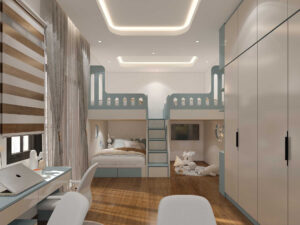 Thiết kế nội thất phòng ngủ cho bé trai với gam màu xanh độc đáo tạo nên cảm hứng, sự thích thú cho trẻ. Đồng thời bố trí và sử dụng nội thất thông minh đa năng như giường tầng, hệ tủ và bàn học mang đến không gian học tập, vui chơi thoải mái dành cho bé đặc biệt giúp tận dụng không gian phòng tối đa.