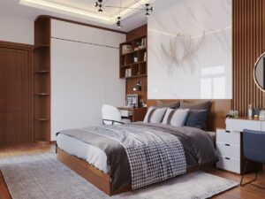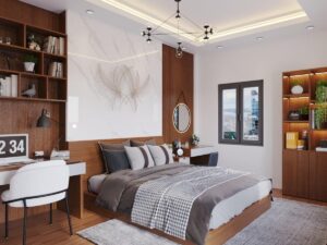 Phòng ngủ được thiết kế đầy đủ công năng như giường ngủ, tủ áo, bàn trang điểm, bàn làm việc, kệ sách, tủ trang trí… với cách sắp xếp hợp lý đảm bảo tối ưu không gian nhưng vẫn đảm bảo đầy đủ nhu cầu của từng khách hàng. Với gam màu chủ đạo là màu nâu gỗ tô nét thêm 1 vài chi tiết màu trắng, giúp không gian thêm sang trọng nhưng không kém phần hiện đại, mát mẻ và trẻ trung.