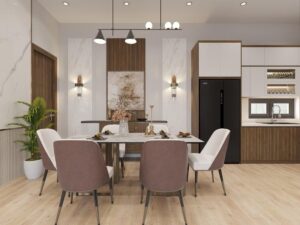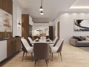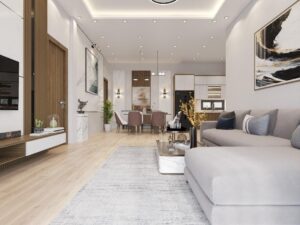 Báo giá thiết kế – thi công hoàn thiện nội thất cho căn hộ 1 phòng bếp, 1 phòng khách và 1 phòng ngủ với gam màu nâu gỗ chủ đạo mang đến một không gian sang trọng, thanh lịch và tinh tế.