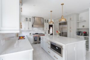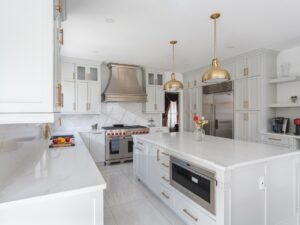 Hệ thống tủ bếp tân cổ điển kết hợp với trang thiết bị bếp hiện đại đảm bảo chức năng của căn bếp mà không làm ảnh hưởng đến vẻ đẹp của toàn không gian.
