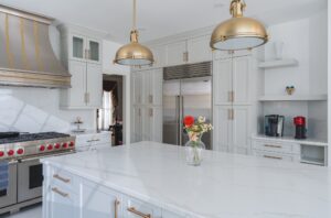 Có thể thấy nguyên hệ thống tủ bếp này đều mang một nét thanh mảnh và đường phào chỉ ấn tượng. Nó mang đến cho không gian một vẻ đẹp trang nhã, quý phái và vô cùng ấm cúng, gần gũi.